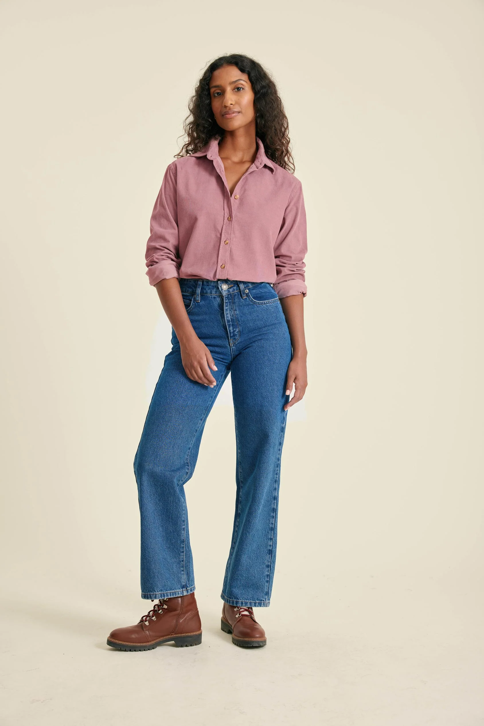 - Fine needle cord shirt with a centre back box pleat and curved hem for ease